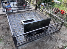 В ходе работы над данным заказом нам предстояло: переустановить покосившийся широкий памятник из чёрного гранита; покрасить обветшавшее от времени ограждение; обновить надписи на надгробье; установить прямоугольный цветник, а также выложить землю на участке гранитной брусчаткой. Приехав на место захоронения мы застали могилу в заброшенном состоянии: на всей её территории росла сорная трава, практически полностью скрывавшая памятник.